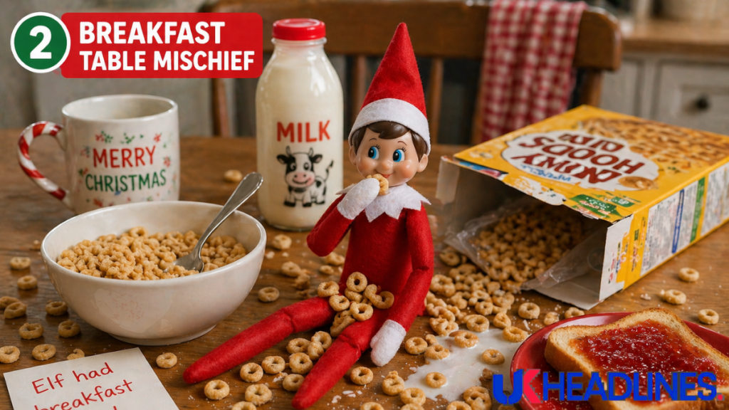 Place the elf beside cereal boxes, toast crumbs, or a plate of biscuits as if it enjoyed an early breakfast before everyone woke up. Kitchens provide ready-made props, so this scene is ideal for busy parents. It remains one of the most popular easy elf on the shelf ideas uk because it is quick, funny, and guaranteed to make children smile before school.