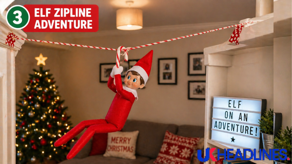 Tie string or ribbon across the room and attach the elf so it looks like it is flying through the air on a daring zipline mission. Children instantly notice the action and movement, which makes the display feel extra magical. This idea adds excitement without much effort and turns an ordinary room into a mini Christmas adventure zone.