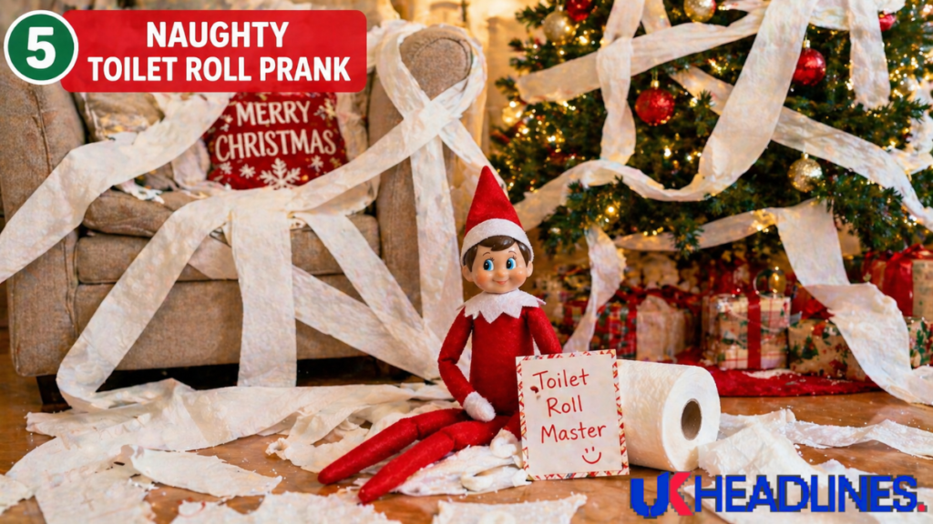 Wrap a chair, doorway, or Christmas tree with toilet roll and leave the elf nearby looking proud of the chaos. Children usually burst into laughter when they see the playful mess. This remains one of the top naughty elf on the shelf ideas because it feels mischievous and memorable without causing any real damage or stress.