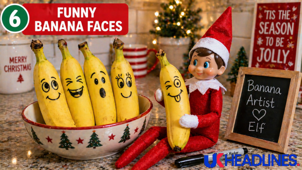 Draw silly eyes and smiles on bananas using a marker, then place the elf beside them as the cheeky artist. It is a brilliant breakfast-time reveal that children notice straight away. Among all funny elf on the shelf ideas, this one stands out because it costs nothing extra, uses everyday items, and takes less than two minutes to prepare.
