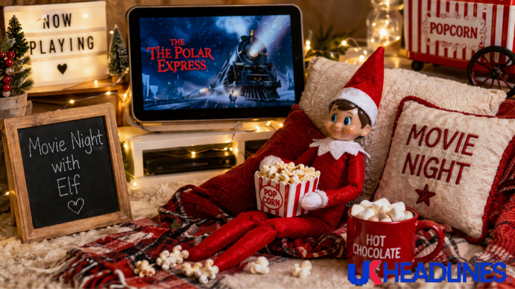 Create a cosy cinema scene with cushions, popcorn, and the elf relaxing in front of a toy screen or tablet. This setup feels warm, festive, and perfect for winter evenings. It can even inspire a family Christmas film night later, making the elf surprise part of a wider festive memory rather than just a morning discovery.