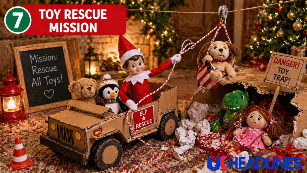 Hang the elf from a shelf or drawer using string while it “rescues” a favourite teddy or toy below. Action scenes like this are exciting because they tell a story children can imagine long after breakfast. It is one of the most creative best elf on the shelf ideas and works wonderfully when you want something playful and different.